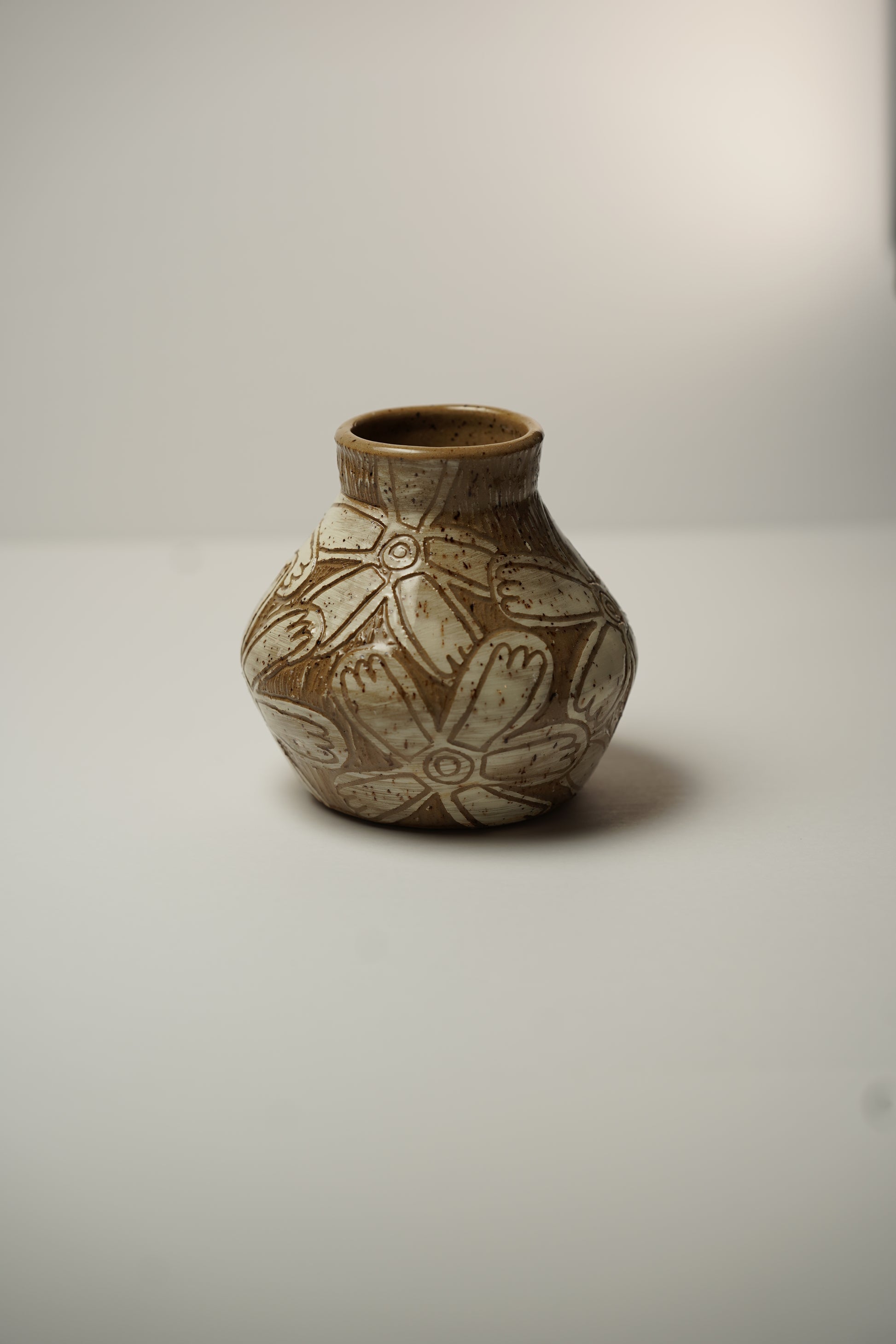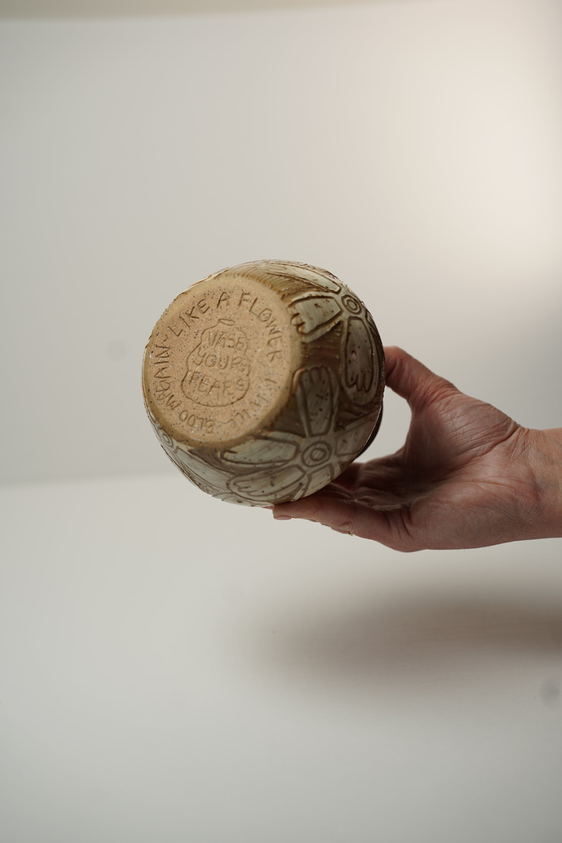 Brown vase with white flowers. "Like a flower I will bloom again" is written on the bottom.