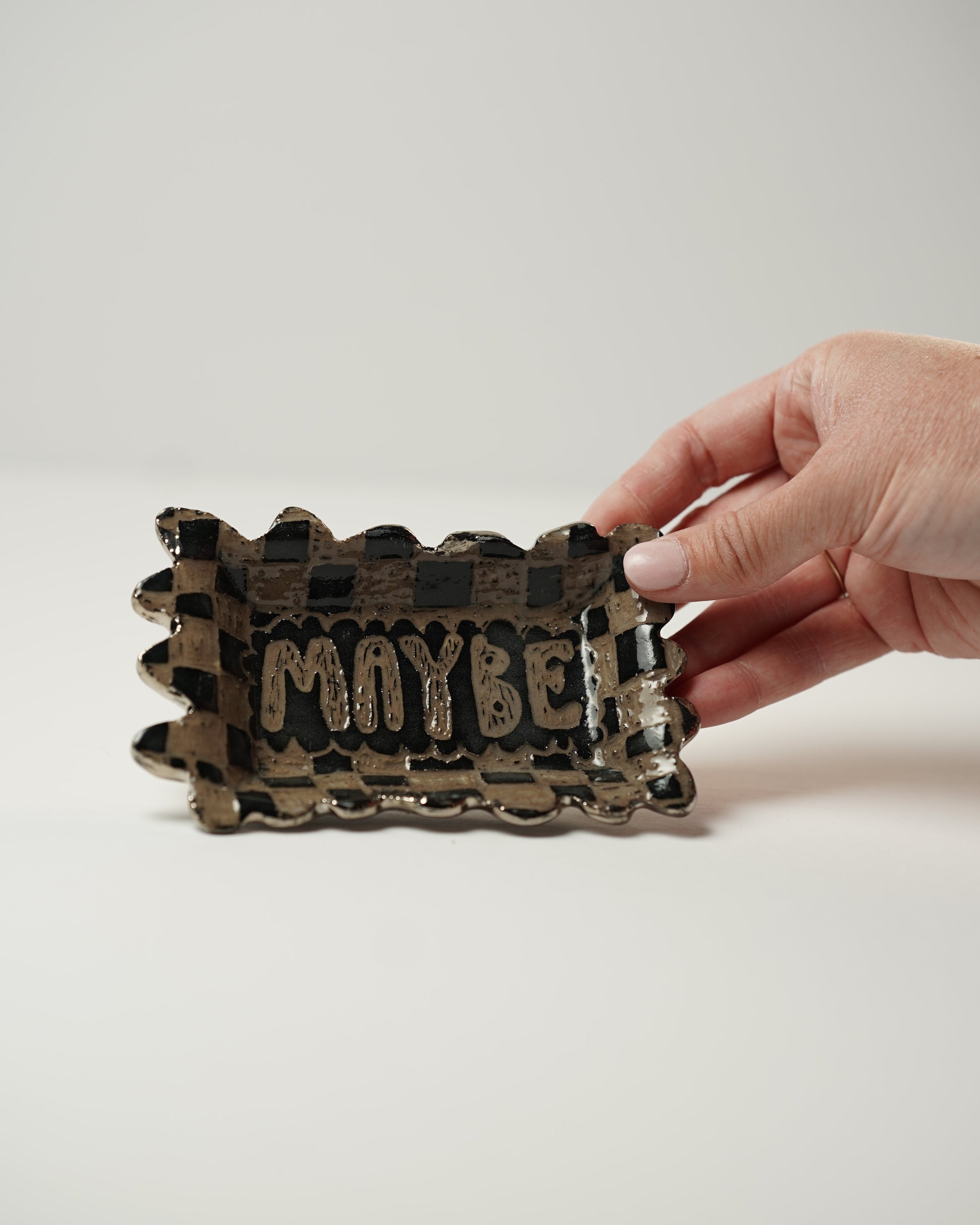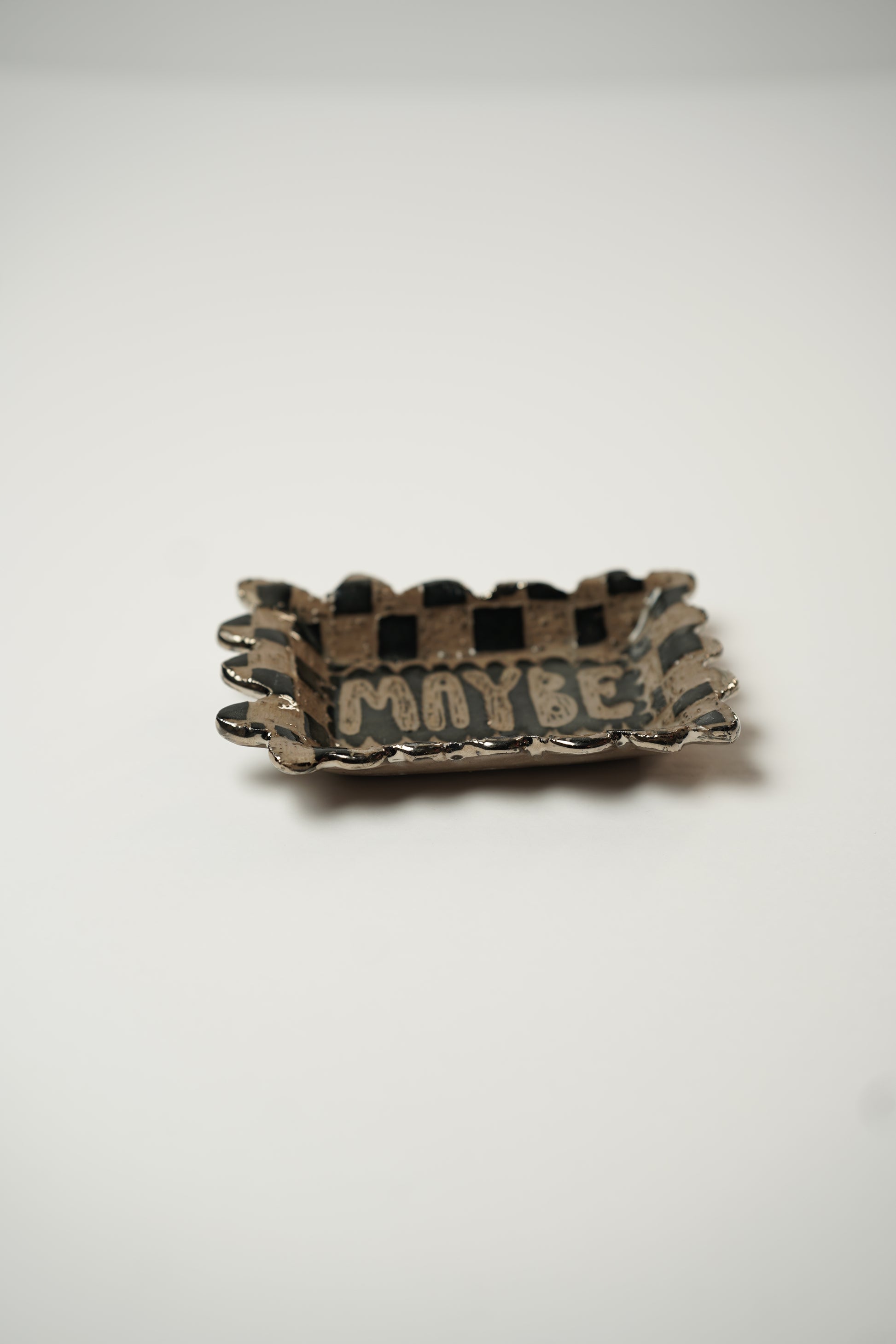 Brown trinket tray with black checkers. Real 22k white gold along the edge. (Not microwave or dishwasher safe.)