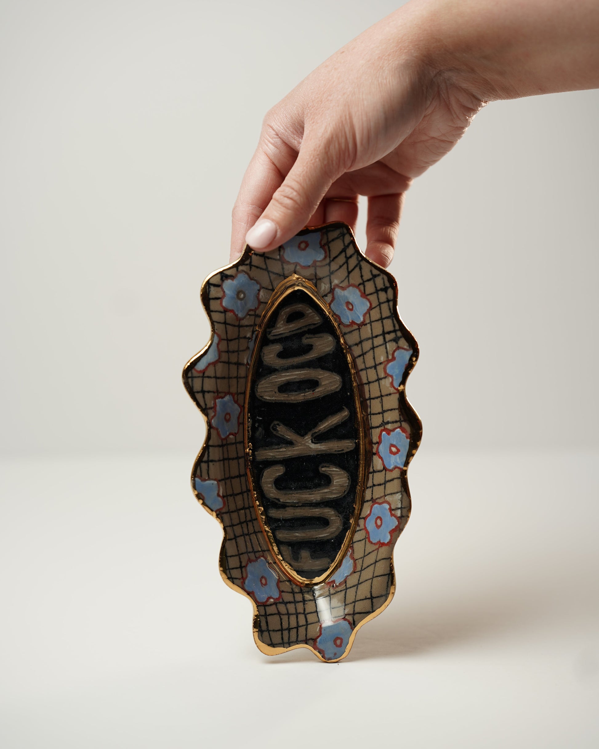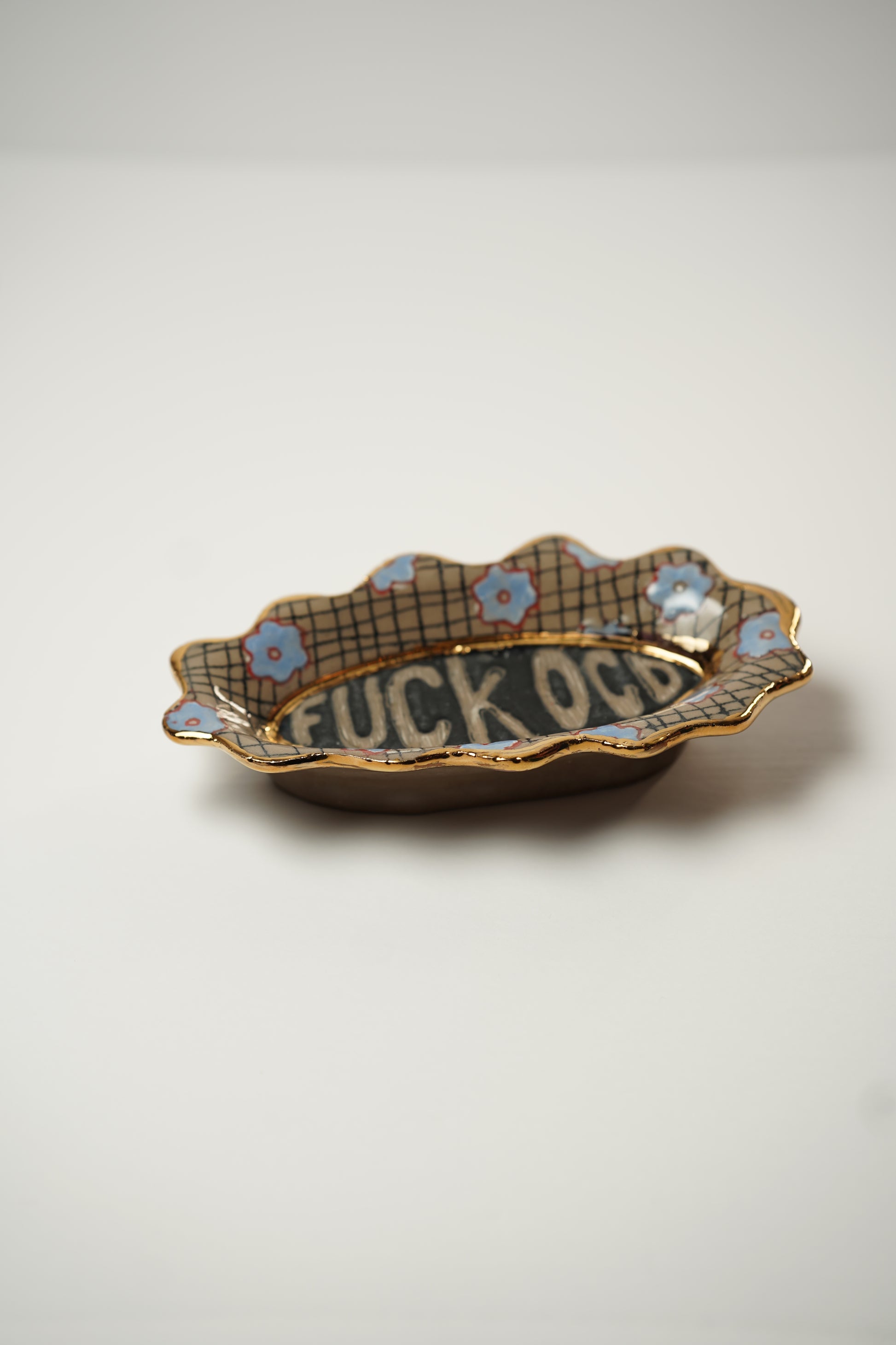 Brown trinket tray decorated with black checkered lines, blue flowers, and SO MUCH GOLD! This trinket tray has real 22k gold around "F*ck OCD" and around the edges. (Not microwave or dishwasher safe.)