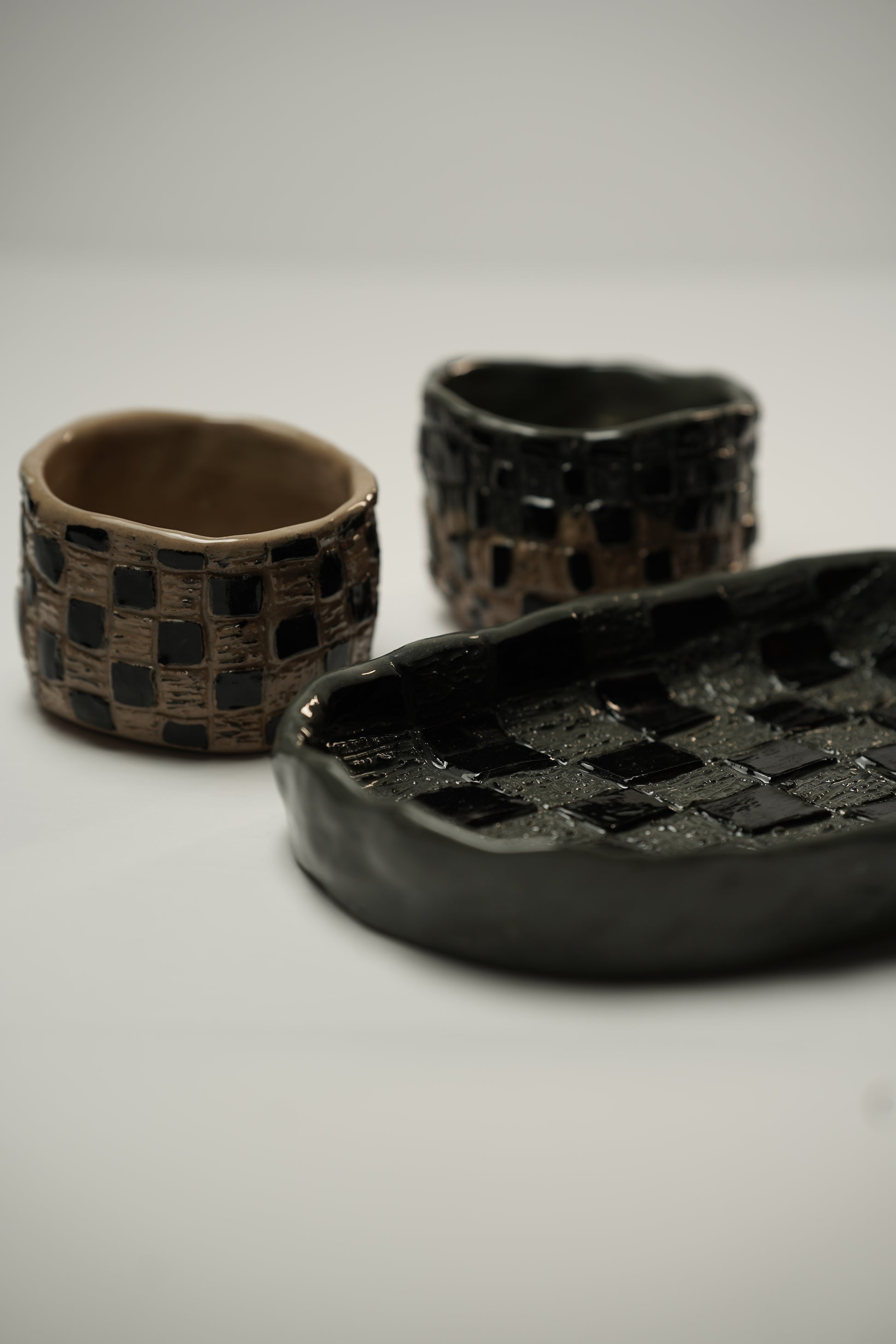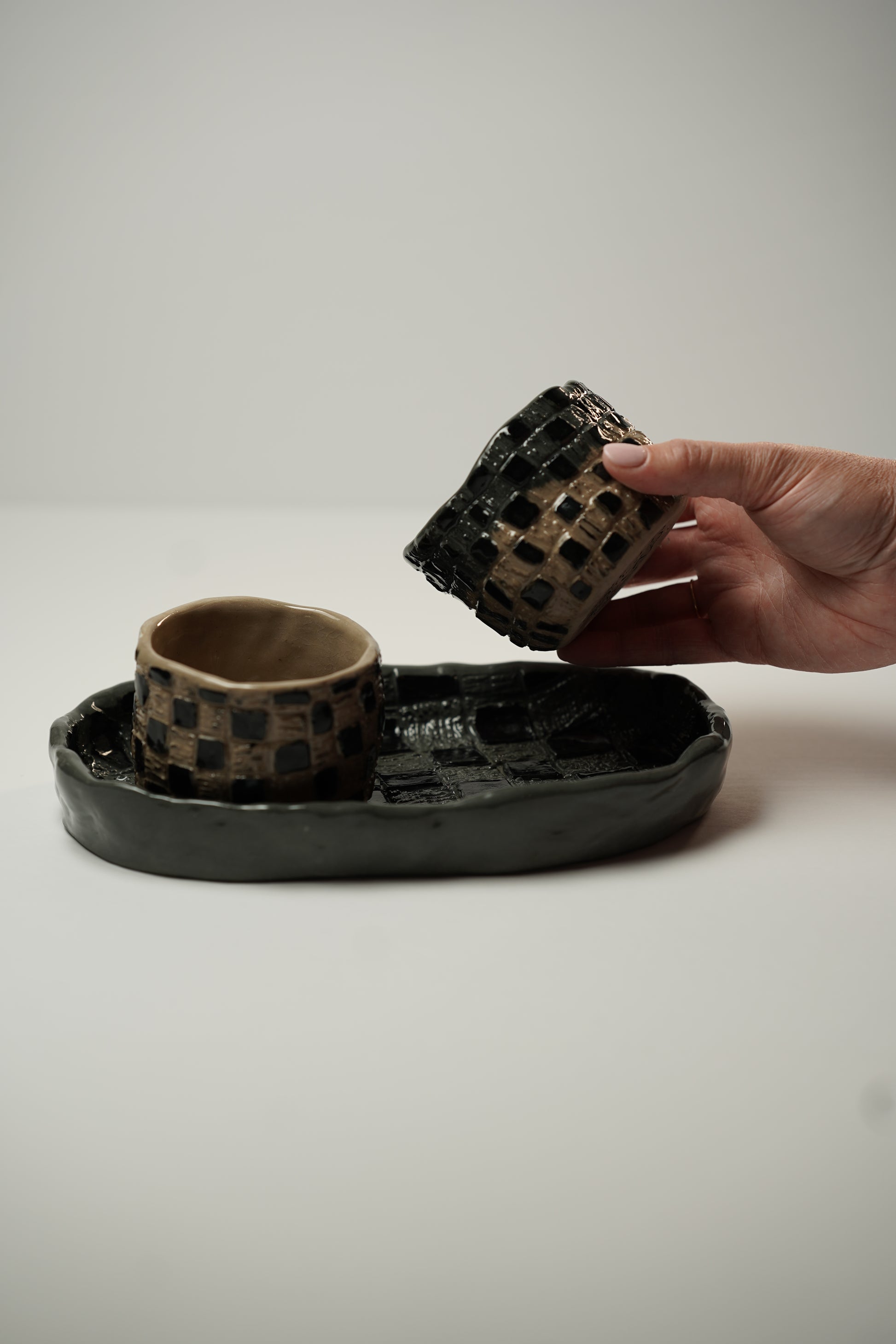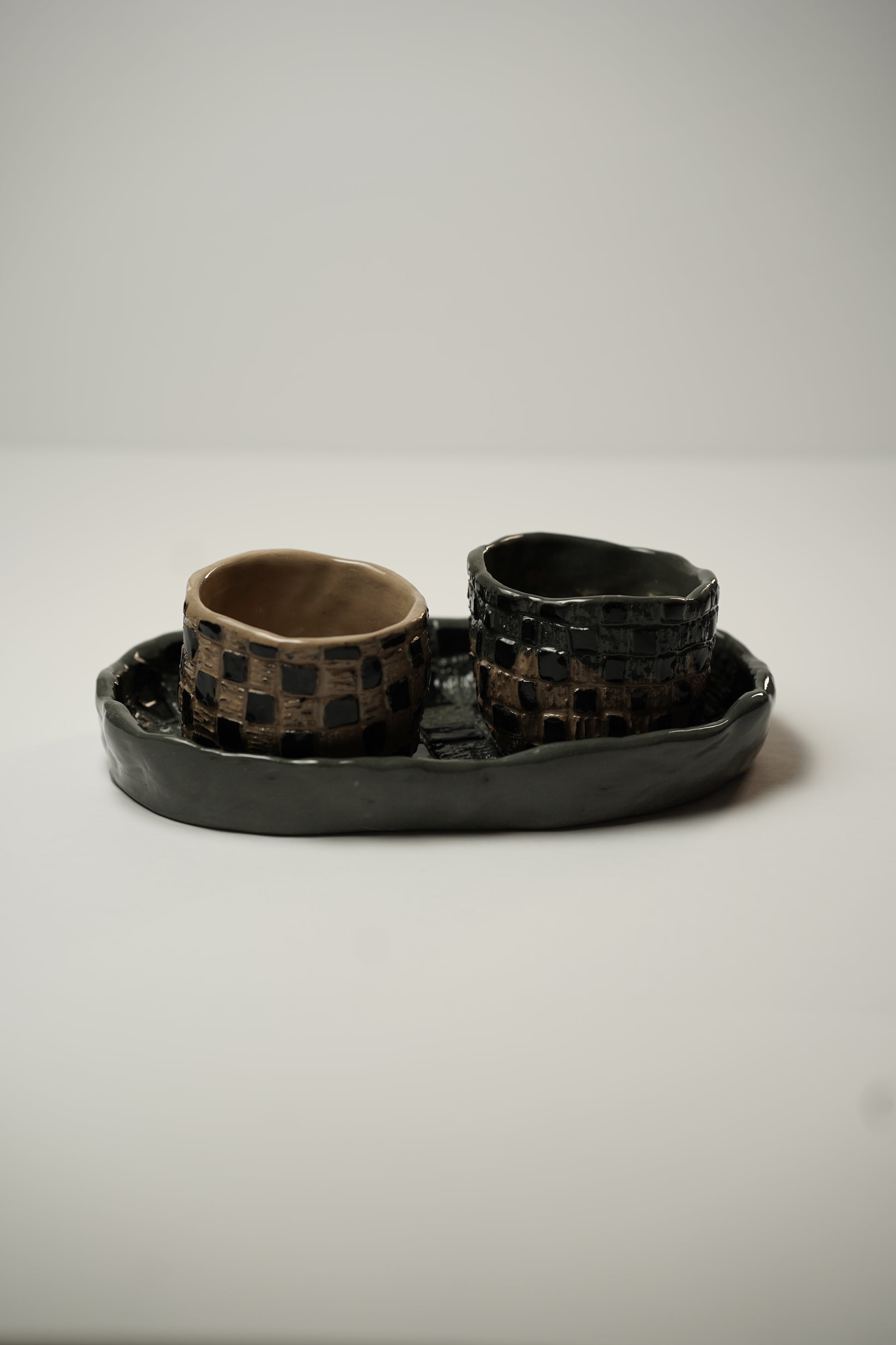 Black and brown checkered tumbler set with a tray to match! Microwave and dishwasher safe!