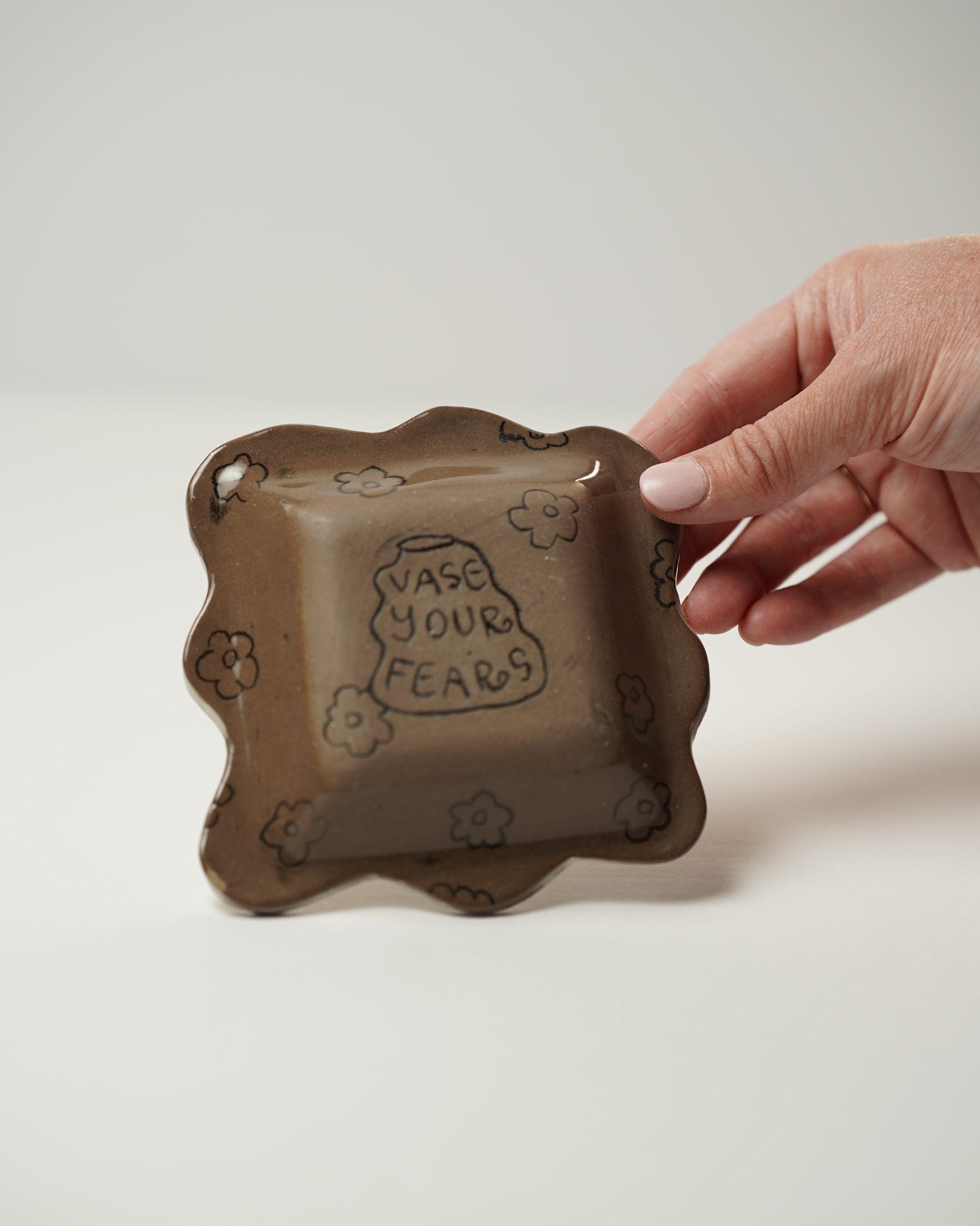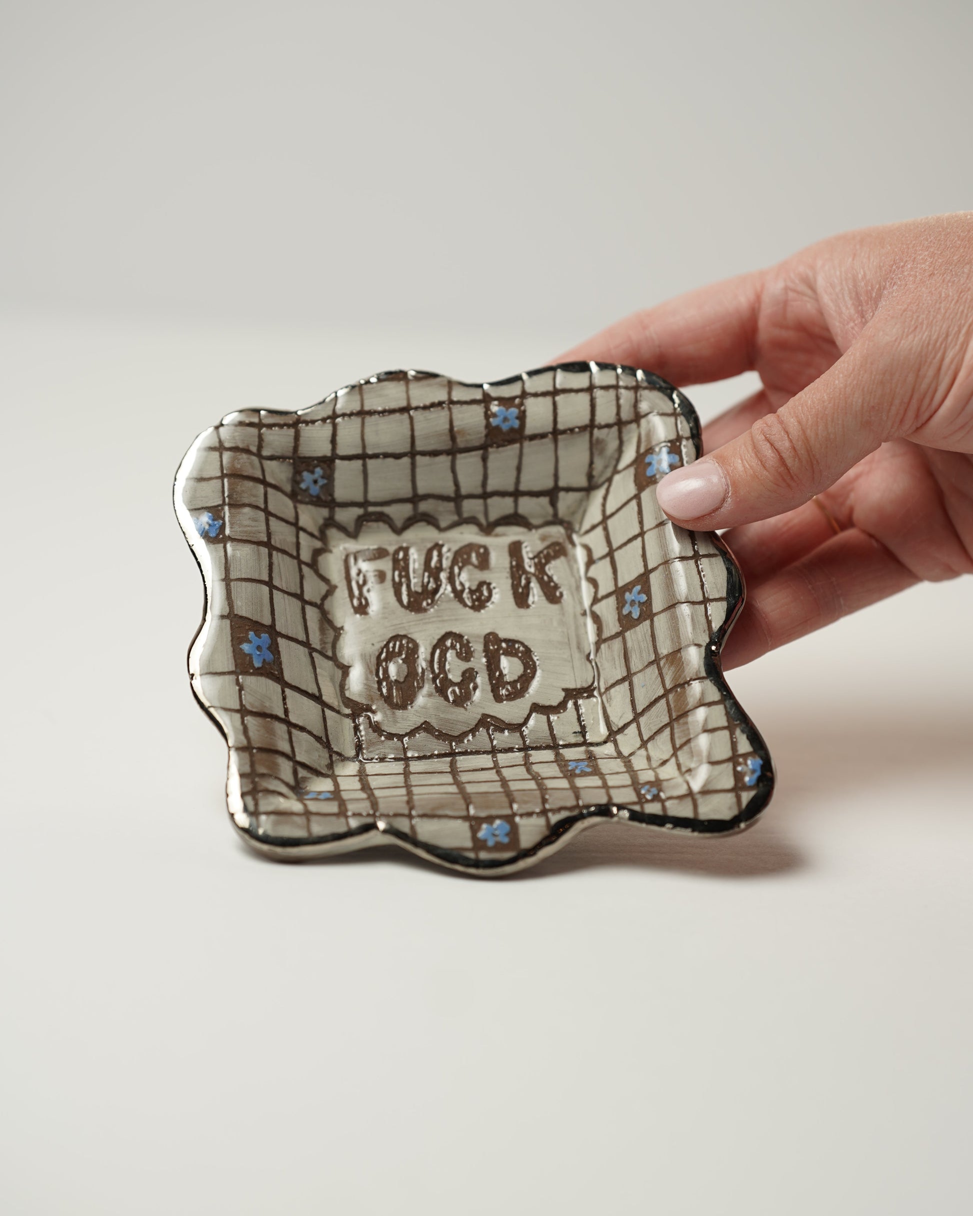 Brown trinket tray with checkers and blue flowers. Real 22k white gold around the edges. (Not microwave or dishwasher safe.)