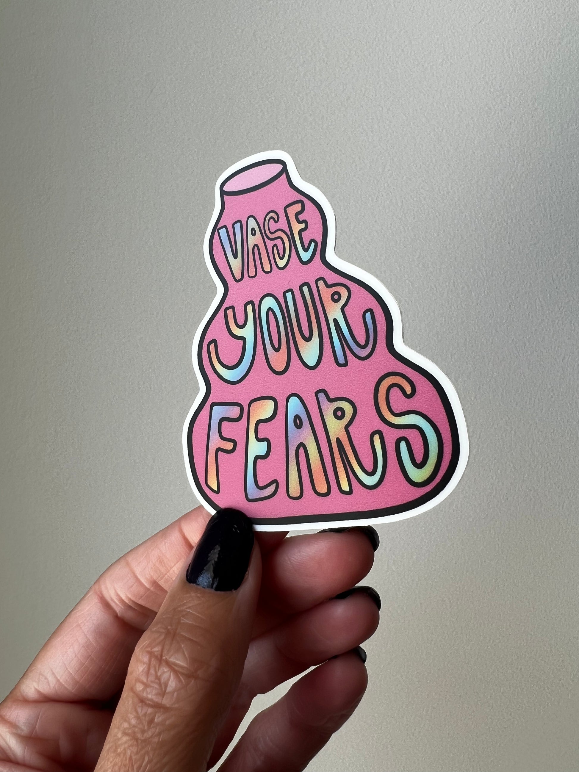 - Vinyl sticker that says "vase your fears" in rainbow font on a pink background